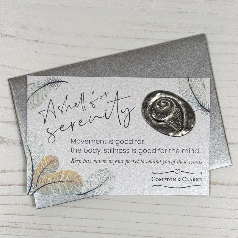 A pewter sea shell mounted on a luxury pearlescent card with delicate feather detail on the background by Compton & Clarke