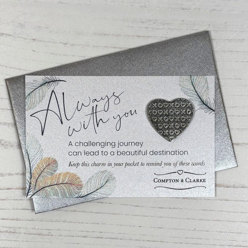 A pewter heart covered in hugs and kisses mounted on a luxury pearlescent card with delicate feather detail on the background by Compton & Clarke