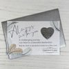 A Pewter charm mounted on luxury pearlescent card with silver foil accents printed heart and dots.