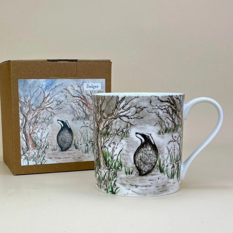Illustrated by Sarah Pettitt, the delightful image of a badger under the trees adorns this adorable fine bone china mug by Heaven Scent.