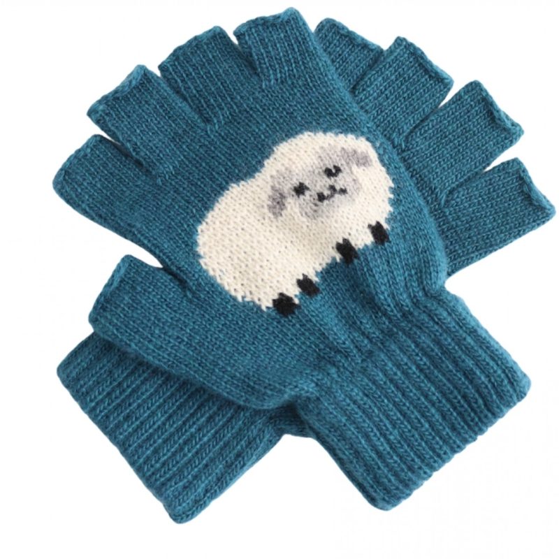 From Lua these lovely Blue fingerless gloves with Sheep design.