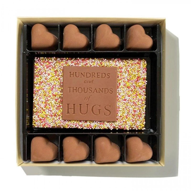 This delicious chocolate gift by Choc on Choc contains a milk chocolate slab covered in Hundreds and Thousands and eight milk chocolate hearts.