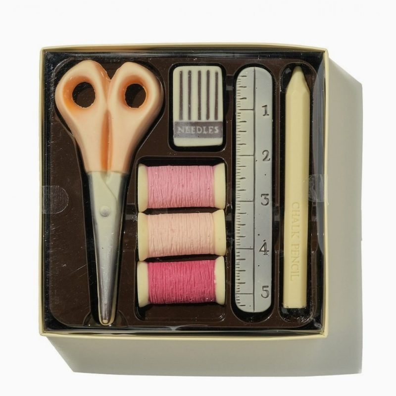 This sewing kit gift contains 3 chocolate cotton reels, chocolate scissors, sewing needles, ruler, and chalk pencil, all handcrafted by artisan chocolatiers at Choc on Choc with a blend of the finest Belgian dark and white chocolate.
