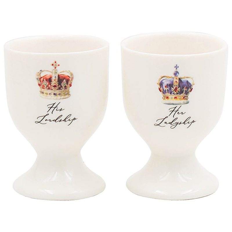 The Crowned Lordship & Ladyship Egg Cup Pair is a charming set made from fine china, featuring a traditional design with lovely egg bowls.
