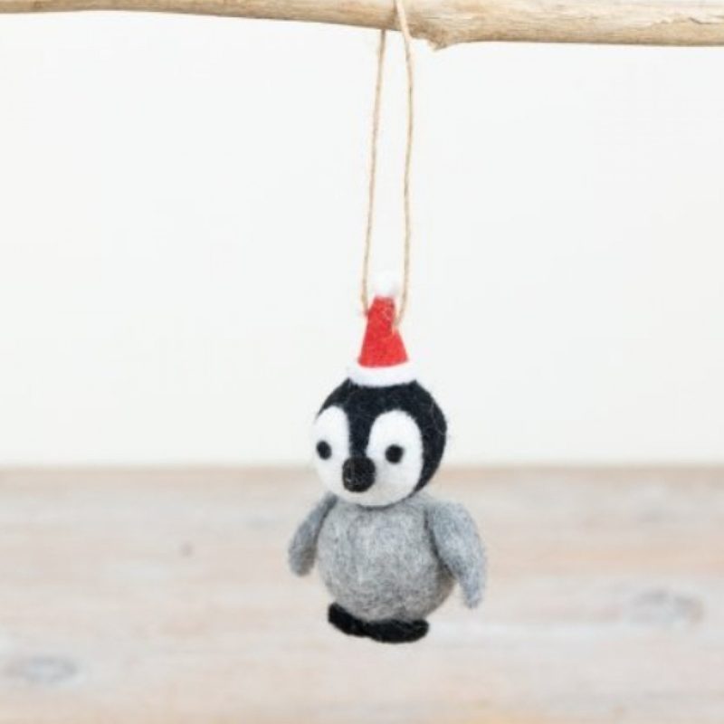 Featuring a dinky felt penguin in black and white, whilst wearing a Christmas hat.
