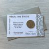 A pewter charm featuring an original lucky sixpence mounted on a white pearlescent card with silver lace effect side border.