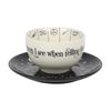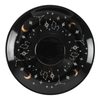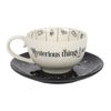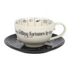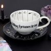 Features a variety of fortune telling and astrological symbols accented by gold foil, a contrasting black saucer, and mystical 'Mysterious things I see when telling fortunes in tea' text.