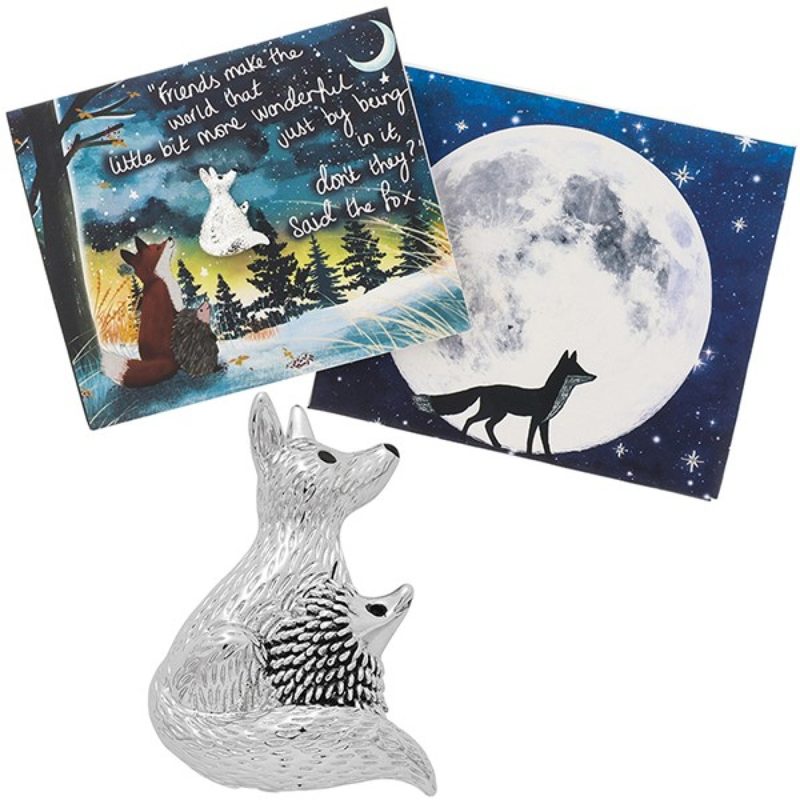 This lovely Fox and Hedgehog pin with magnetic fastener is attached to a small gloss finish illustrated card, complete with a Fox Under the Moon presentation envelope.