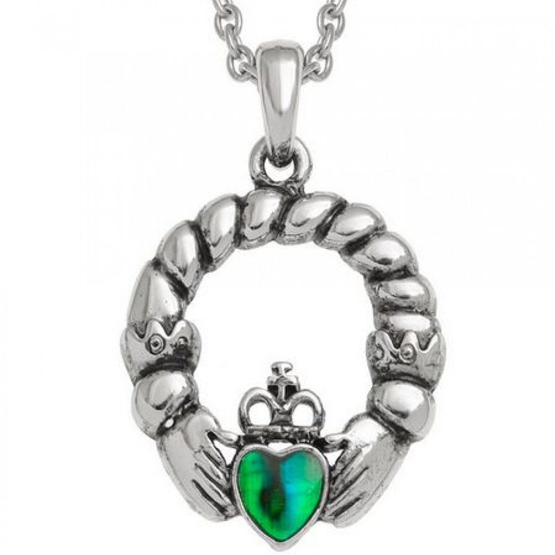 Green Celtic claddagh design Tide Jewellery inlaid Paua shell Pendant.