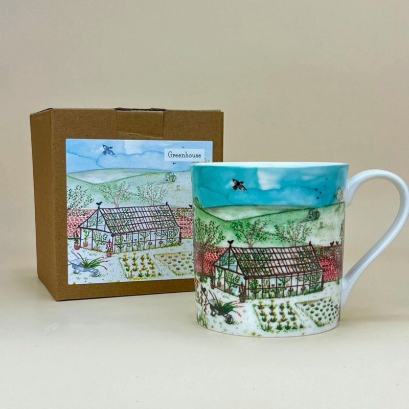 Illustrated by Sarah Pettitt, the delightful image of a lovely rural garden and greenhouse this adorable fine bone china mug by Heaven Scent.