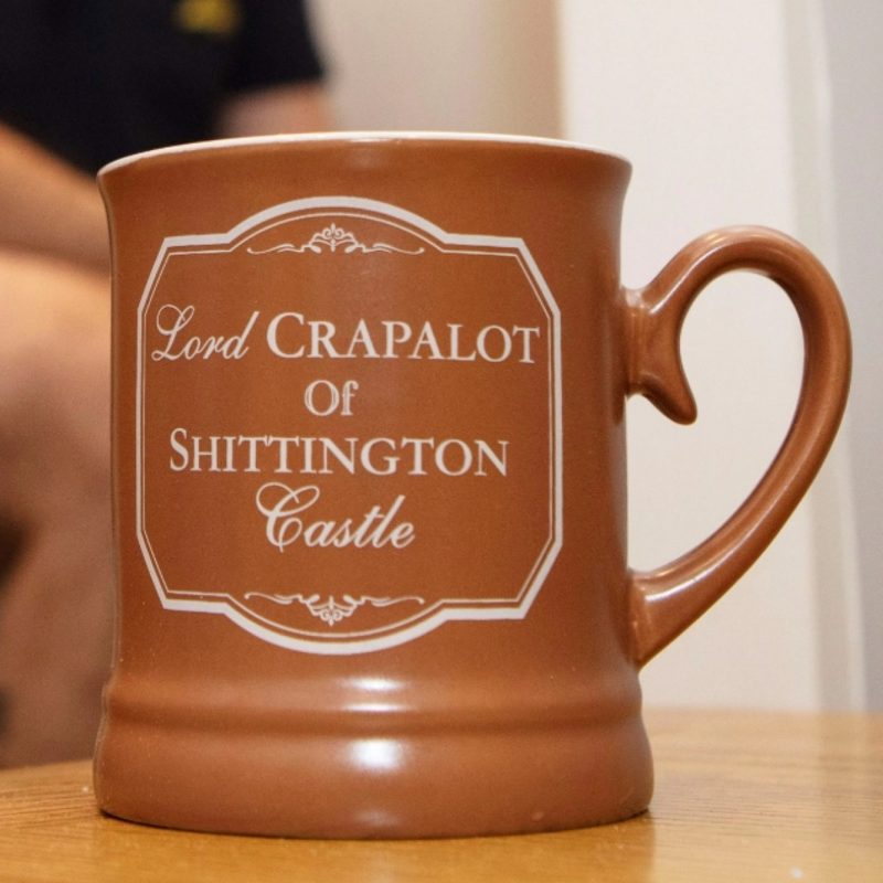 The Lord Crapalot of Shittington Castle Victoriana mug is a Classic brown with stylish white detail.