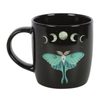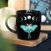 This black ceramic mug features a captivating and intricate luna moth design, including moon phases, stars and flowers.