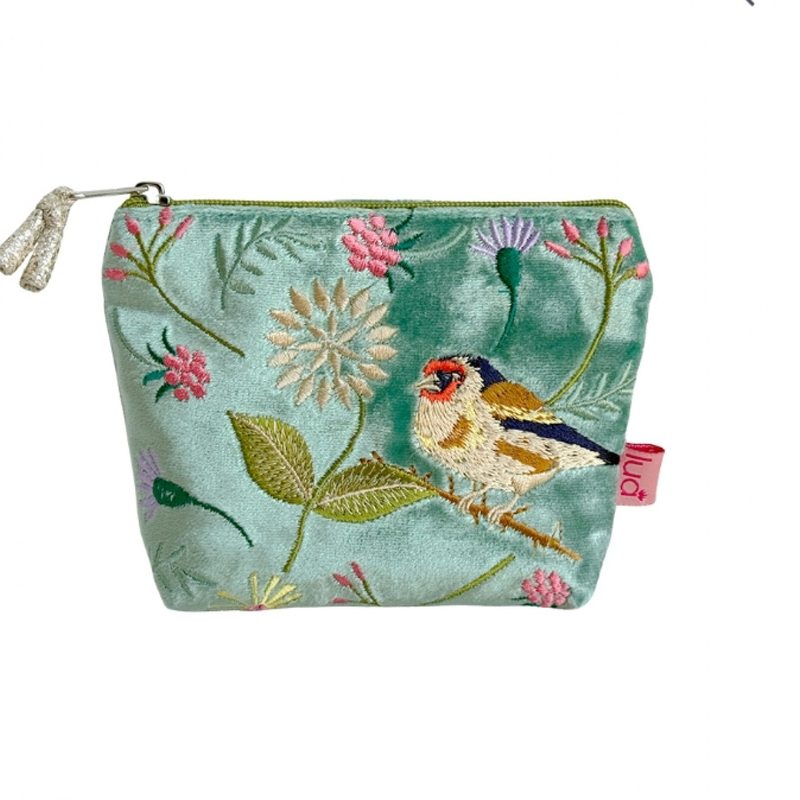 This Goldfinch Aqua Mini Velvet Purse from Lua is in a pretty aqua colourway featuring a sweet goldfinch perched on a branch amongst the embroidered floral design.