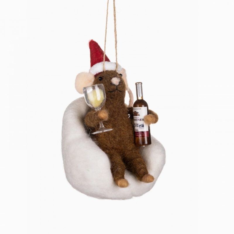 Mouse on Armchair with Christmas hat, a bottle of wine and wine glass Felt Decoration
