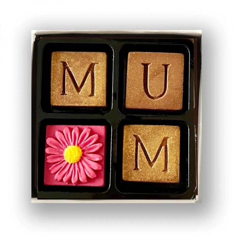 This cute little box contains three milk chocolates (M U M) dusted with edible gold dust, and crafted flower chocolate