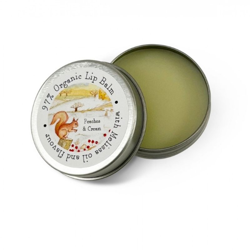 This is Peaches & Cream Lip Balm by Heaven Scents Winter Range with a beautiful Squirrel illustration