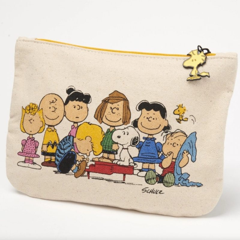 This Peanuts vintage style screen-printed pouch features Snoopy and the Gang on the front and Snoopy on his House on the back.