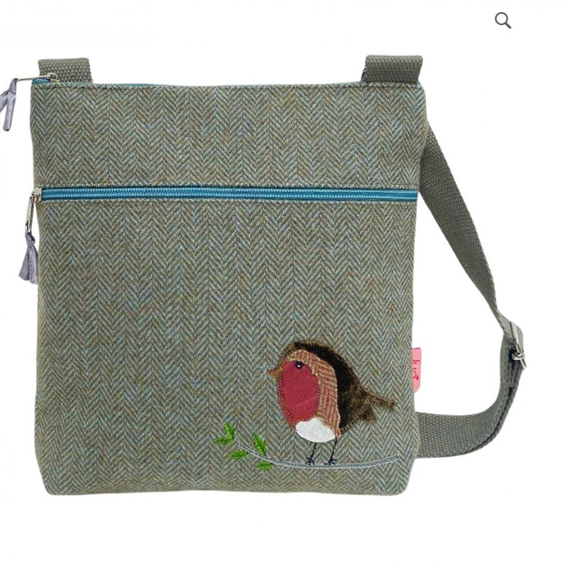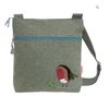 A cross body messenger bag with an appliqued silky robin on a branch by Lua