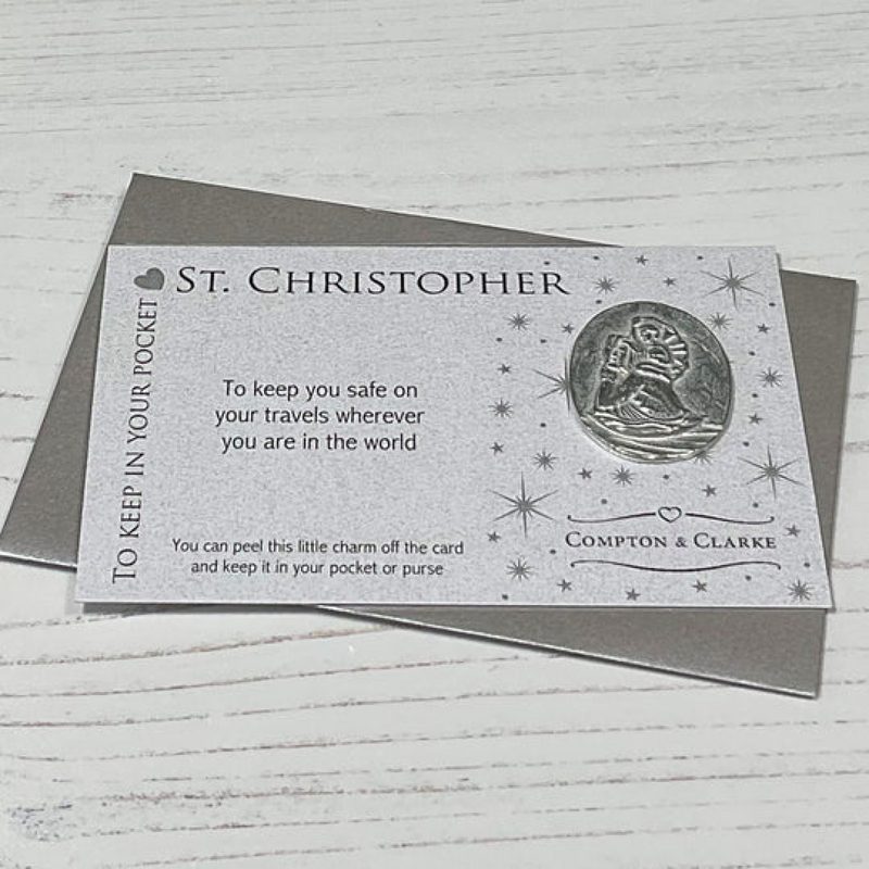 A Pewter charm mounted on luxury pearlescent card with silver foil accents printed heart and dots.