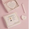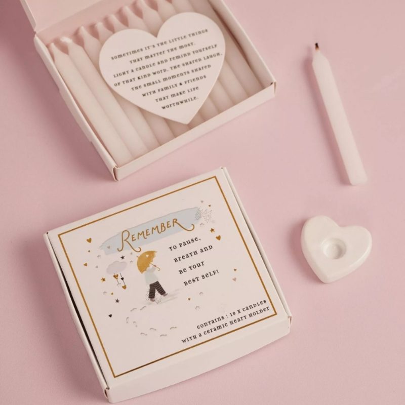 Inside is ten lightly scented white slim candles and a white ceramic heart holder together with a heart shaped tag explaining that sometimes it's the little things that matter most. Light a candle and remind yourself of that kind word, the shared laugh, the small moments shared with family & friends that make life worthwhile.