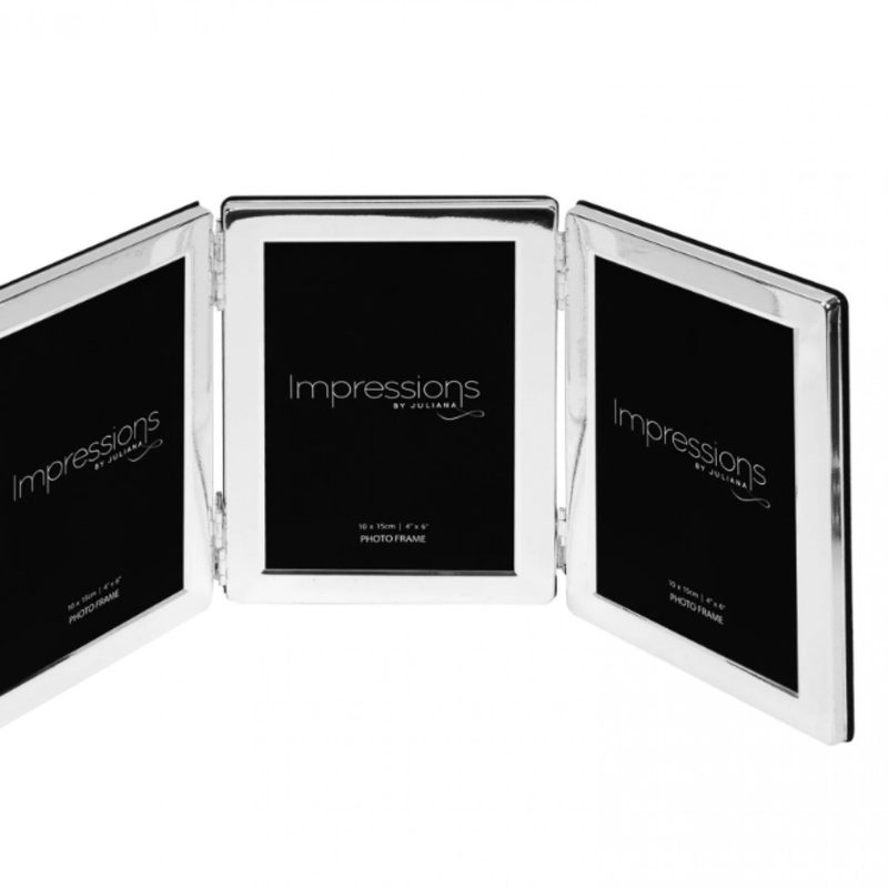 A hinged silver plated triple aperture photo frame from IMPRESSIONS® by Juliana.